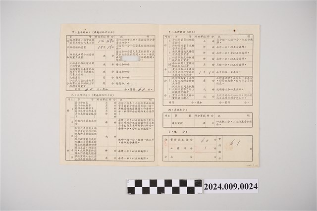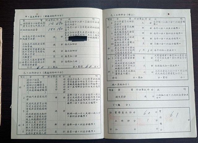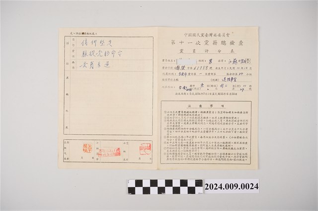 本件「中國國民黨臺灣省委員會第十一次黨籍總檢查黨員評分表」由台南市黨部第一區黨部第34小組製發,考核對象為國登字第61788號黨員,考核日期為1965年7月1日至1966年6月30日。考核項目包含基本評分、一般工作評分、特殊貢獻評分等項,下各分細項。該次評分為61分。