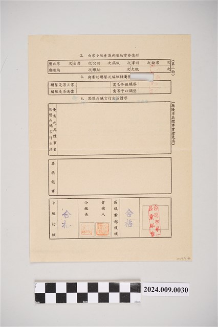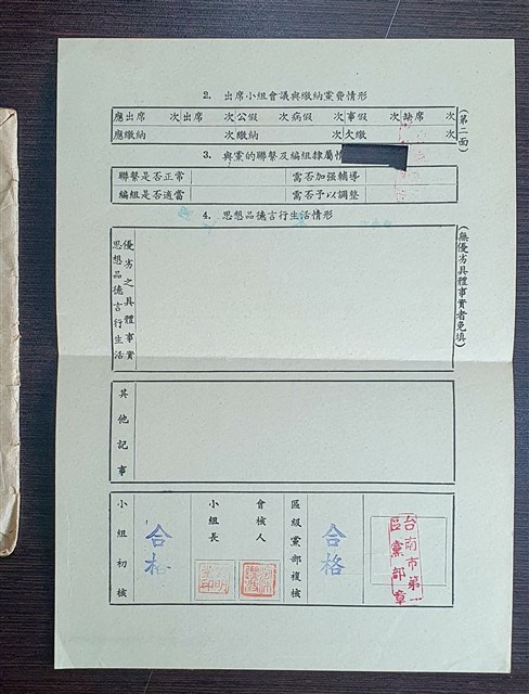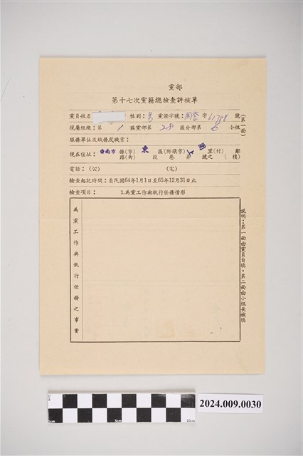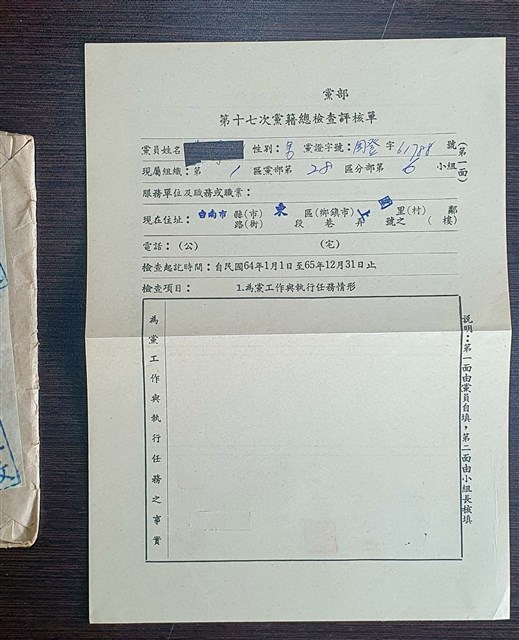 2024.009.0030 中華民國65年台南市第一區黨部第十七次黨籍總檢查評核單