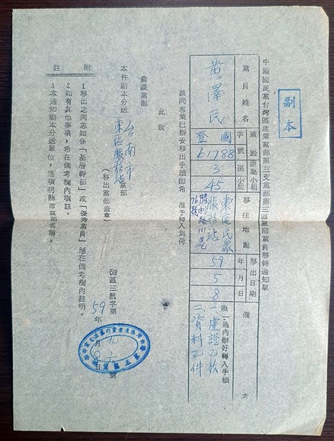 2024.009.0039 中華民國59年5月8日中國國民黨台灣區產業黨部第三支黨部第三區黨部黨員移轉通知單