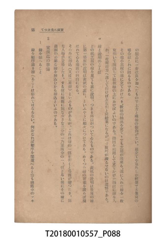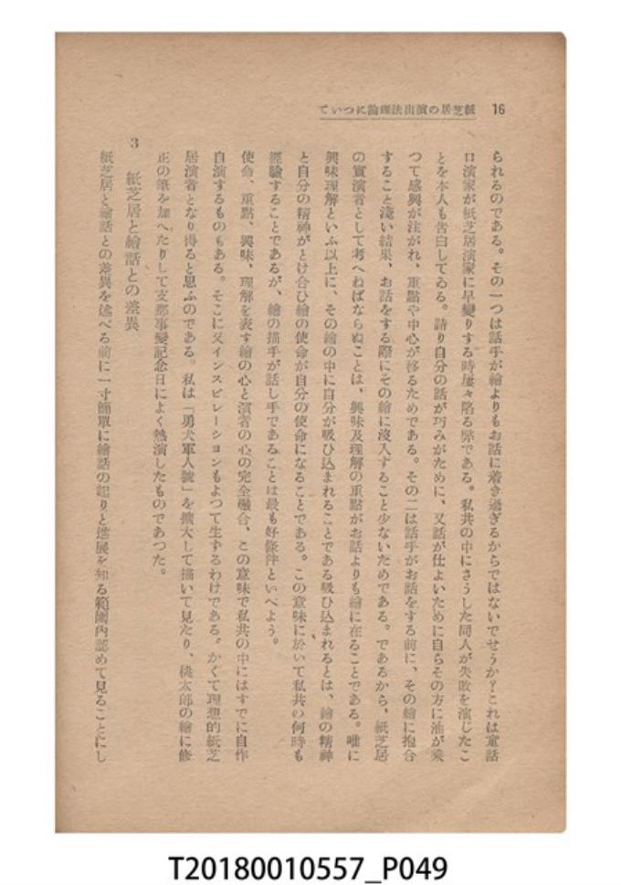 1.本物件為臺南紙芝居研究會發行的《紙芝居演出法》,紙芝居是日文連環圖話劇之意。書本為平裝。封面、封底以上白、下橙為底色,封面上半部以紅字由右而左橫寫「紙芝居演出法」書名,書名下方有黑字「臺灣ニ於ケル其ノ運動」副標題(按:其在臺灣的運動);下半部繪製紙芝居演出圖畫。封底繪製母親帶孩童往廟口觀劇的圖畫。正文前放入數張紙芝居演出情況及相關人士照片;照片頁後為目次;目次後為嘉義專修工業學校長井上德造、臺南師範學校長本田乙之進、臺北帝國大學教授植松安等數人所撰寫的序文及代序。內容包括紙芝居說話技巧之活用、關於紙芝居演出法之理論、有關紙芝居之實演、紙芝居之前置工作、在華麗島和大陸之進行、遵循行腳之跡、放送紙芝居操作、皇紀二千六百年奉祝紙芝居大會、我的活用紙芝居方式等10個部分。正文後附錄日本教育紙芝居協會活動一覽圖。最末頁是版權頁,上載著作、發行、印刷及定價資訊。
