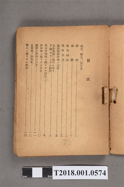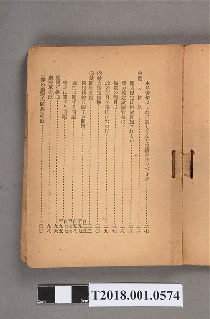 1.本物件是日治後期皇民化時期發行的《皇民鍊成臺灣青年必携》書籍。書本為平裝。封面中央繪製直長方形框,框內印刷書名。內頁之首為編者序,再次為目次。內容大致分為6個部分:第1部分是神勅、日本國歌歌詞及各種詔書、勅語、令旨;第二部分是皇民奉公會相關文章;第三部分是有關臺灣特別志願兵制度文章;第四部分是體力檢定的相關文章;第五部分是國民精神、德性、時局等相關問題試問應答;最後是數首愛國歌曲的詞譜。內頁最末是版權頁,上載編著、印刷、發行等相關資訊。