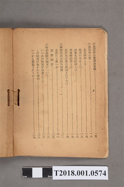 2.1936年中日戰爭爆發前夕,日本當局在臺推行皇民化運動,皇民化運動的目的,在鍛鍊臺灣人成為與大日本帝國休戚與共的天皇臣民,「皇民鍊成」即為皇民化時期常見的口號。1941年,日本當局在臺灣設立皇民奉公會,皇民奉公會是標榜文武官民為舉國一致、建立國防國家體制、徹底貫徹皇國精神的組織。其進一步對男子青年加以組織性之皇民鍊成訓練,為即將實施的志願兵制度扮演挺身指導者的任務。本物件即是在這樣的背景下編纂而成。