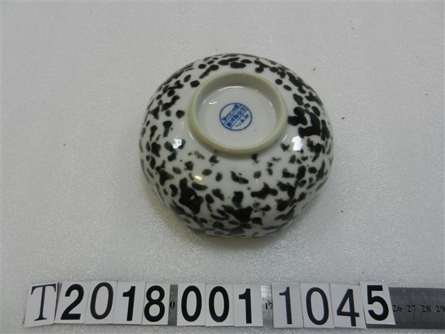 本物件為陳新智商店八角形碗。為陶製材質,底色為白色,碗面鑲有藍邊。碗底有紋路。碗身為豹紋圖案,碗底中間有「八甲町 陳新智商店」字樣。八甲町位於今臺北市萬華區。