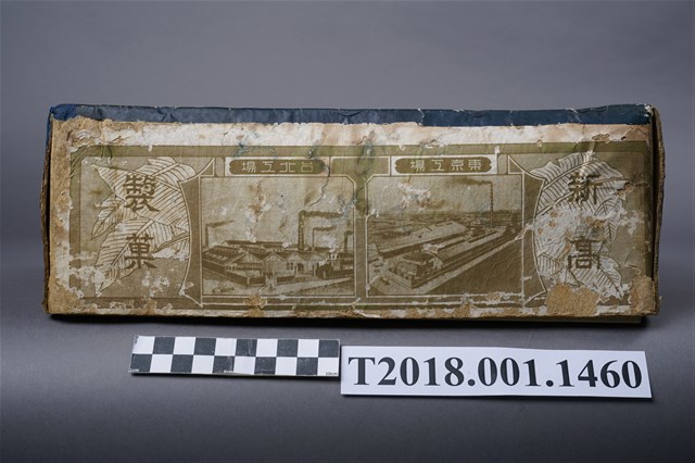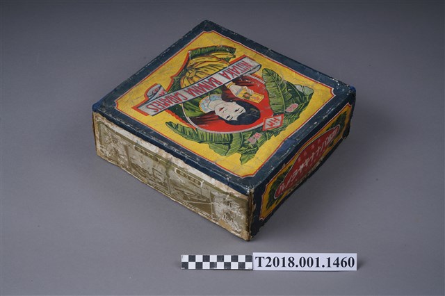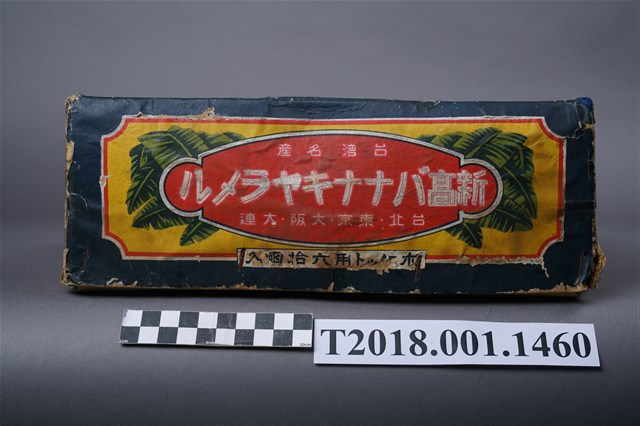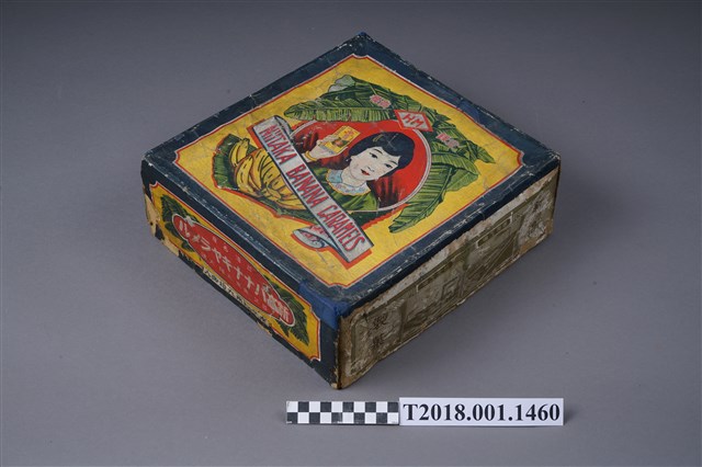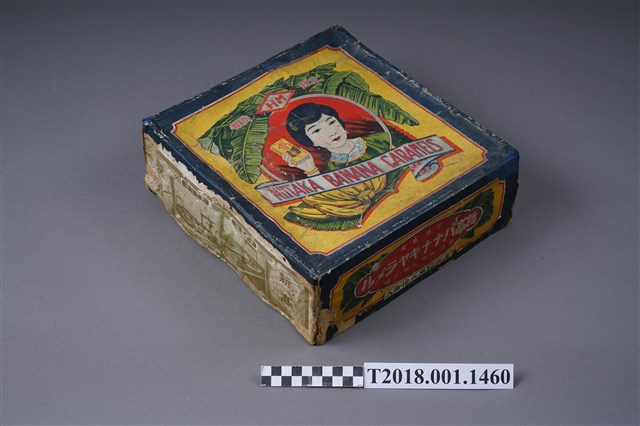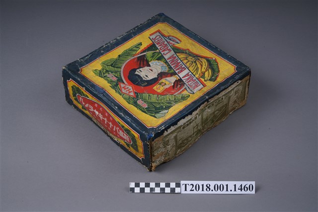 1.本物件為新高製菓出品香蕉牛奶糖盒。紙製品。圖面為藍底,正面繪有一串香蕉,以及一位穿著綠衣的仕女手拿一盒牛奶糖。盒上印有登錄商標、NIITAKA BANANA CARAMELS。側邊印有新高バナナ キャラメル(按:香蕉牛奶糖)、臺灣名產、臺北、東京、大阪、大連、ポケット(按:包裝)用六拾函入。另一側則寫著大日本名古屋三ツ矢製菓合名株式會社,並繪有工場圖片。 2.新高製菓是1905年創立於臺北的製菓會社。創立者為出身於佐賀的森平太郎。最有名的商品是水果糖和牛奶糖。1928年時開始販賣口香糖,1931年開發出可以吹泡泡的口香糖而風靡一時。