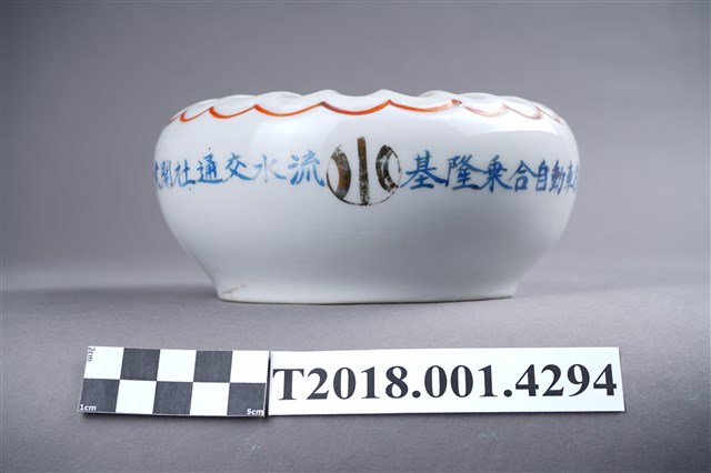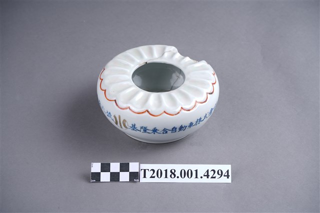 1.本物件為基隆乘合自動車株式會社設立紀念與流水交通社開業紀念菸灰缸。為瓷器,白色圓形。正中央有「水」字樣標記,兩側各寫著「基隆乘合自動車株式會設立紀念」和「流水交通社開業十周年紀念」。底部印有「井手商店製 KEELUNG」字樣。2.基隆乘合自動車創辦者為流水伊助,創立於1921年,最初名為「流水巴士社」,專門經營基隆市公共馬車行駛於基隆車站和八尺門之間,被稱為「流水馬車」。1925年起,公共馬車更新為公共汽車,流水巴士社並於1936年改制為「基隆乘合自動車株式會社」。