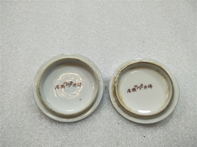 1.本組物件為兩個圓形白色杯蓋。杯蓋頂部繪製黑色的花草圖案。底部圈足中央為商標。商標右側有橫寫「坪井」字樣;左側有橫寫「商店」字樣;上方有橫寫「台北」字樣。
