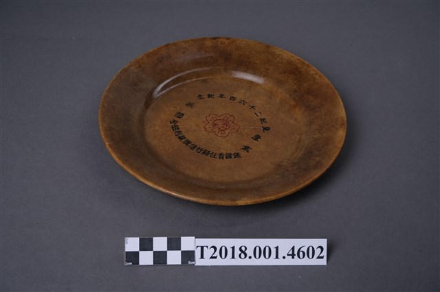 1.本物件為保證責任路竹信購販利組合皇紀二千六百年紀念盤。為陶製品,盤面為圓型,底色為褐色。盤底寫著「皇紀二千六百年紀念」和「保證責任路竹信購販利組合」字樣,及其標誌。底部印有「九谷藤田」。2.1900 年日本本土制定了產業組合法,1910 年臺北信用組合設立後,日本人組合也陸續在臺灣各地成立。因此,臺灣總督府於 1913 年制定了「產業組合法」,全臺共設立了 18 個組合。產業組合是由信用、購買、販賣、利用共 4 個部門所組成,信用組合經營產業資金的融通、存款的金融業。購買組合買入產業或經濟上的必要物資,轉賣給組合員,並以共同購買的方式買進農業生產上需要的肥料、飼料等。販買組合則銷售組合員生產的農產品,例如:米、茶、柑橘等等。利用組合則提供組合員在產業、經濟上所需要的設備,例如:經營電氣設備、用水、乾繭裝置等施設以及農業倉庫。