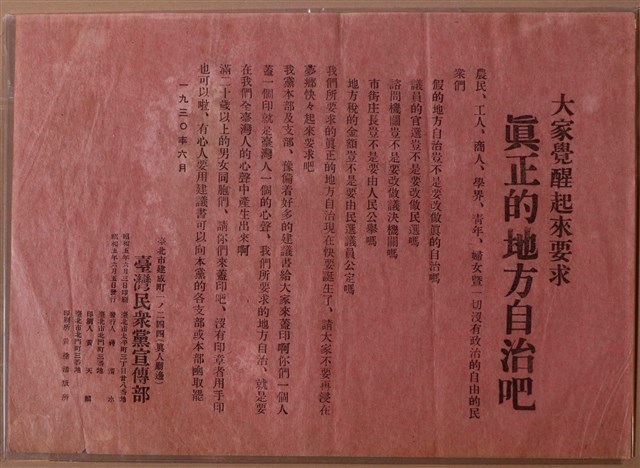 臺灣民眾黨宣傳部發行要求地方自治宣傳單