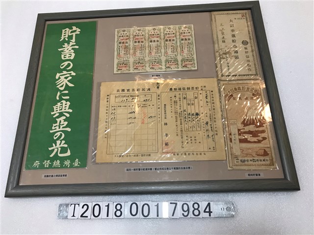 T2018.001.7984 戰時國民儲蓄分配通知單與戰時儲蓄簿與奉公債券與鼓勵儲蓄宣傳標語