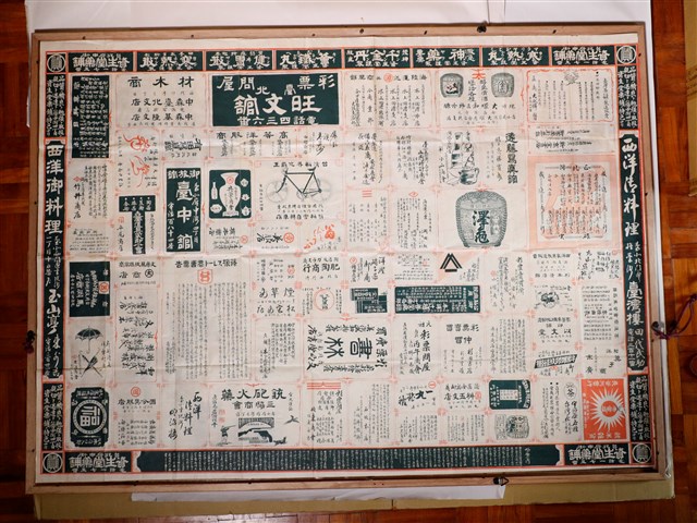 本物件為臺北市區改正全圖,長方形紙張上以畫出臺北市區改正全圖,製圖十分精細與密集,地圖正面兩旁還有許多張黑白照片,為商家介紹,海報背面亦有滿版的商家廣告,如資生堂藥房、臺灣樓、玉山亭等臺灣餐廳、寫真館、材木行等店家相關資訊,整張海報以1個木框框住,保存完整。