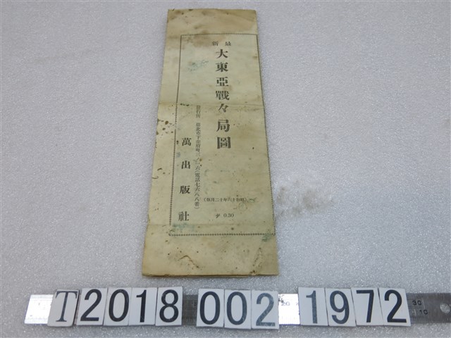1.本物件為萬出版社發行〈大東亞戰戰局圖〉,長方形紙張上畫出東亞地圖,上面標示有太平洋、南洋群島、中華民國與大日本各島,並以紅色標出日本帝國的範圍,及東亞的主要城市、海軍與航空基地,製圖十分精細與密集並畫上經緯度,主要以日文標示,地圖上方寫有最新大東亞戰タ局圖,最下方寫有印製日期、印刷所「寶文社」與發行所「萬出版社」,以及定價金,地圖左編印有「集集信用販賣購買利用組合 贈」,整個物件有明顯的污漬與破損痕跡。2.大東亞戰爭是日本對第二次世界大戰時在遠東和太平洋戰場的戰爭總稱。其目的是為建立以日本為中心的「大東亞共榮圈」,解放受英國、美國、荷蘭殖民的東亞人民及殖民地。這個名稱是在1941年12月12日確定的,其意義為「為大東亞新秩序建設而進行的戰爭」。這一詞在日本戰敗後被駐日盟軍總司令部視為「戰時用語」而禁止使用,如今日本多使用「太平洋戰爭」和「十五年戰爭」兩詞來表示這一時期日本對美英,對東亞和東南亞各國發動的戰爭。