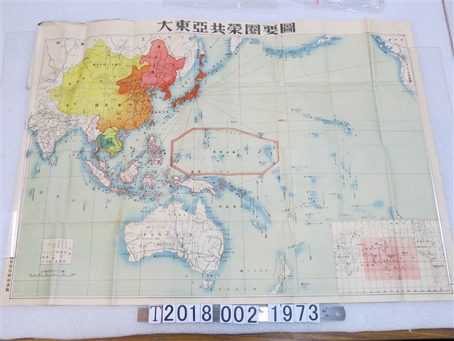 1.本物件為臺灣總督官房情報課編〈二千五百四十萬分之一大東亞共榮圈要圖〉,其封面為黑色底紙上畫有1人形圖案,並寫有「大東亞共榮圈戰局明細圖」,背面攤開在長方形紙張上畫出東亞地圖,上面標示有太平洋、南洋群島、中華民國與大日本各島,並以彩色標出各地區位置,製圖十分精細與密集並畫上經緯度,主要以日文標示,地圖上方寫有大東亞共榮圈要圖,左下角印有所「縮尺二千五百四十萬分之一」,地圖左邊印有「臺灣總督府關防情報課編」,整個物件有些許的污漬與泛黃。2.大東亞戰爭是日本對第二次世界大戰時在遠東和太平洋戰場的戰爭總稱。其目的是為建立以日本為中心的「大東亞共榮圈」,解放受英國、美國、荷蘭殖民的東亞人民及殖民地。這個名稱是在1941年12月12日確定的,其意義為「為大東亞新秩序建設而進行的戰爭」。這一詞在日本戰敗後被駐日盟軍總司令部視為「戰時用語」而禁止使用,如今日本多使用「太平洋戰爭」和「十五年戰爭」兩詞來表示這一時期日本對美英,對東亞和東南亞各國發動的戰爭。