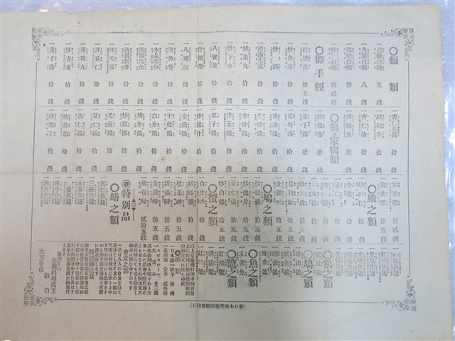 1.本物件為新日本新聞社印刷臺灣館內臺灣料理店菜單,方形紙張上寫有臺灣料理與其他國家料理不同處,並且比較其口感,下方並繪有客人圍坐桌旁,互相聊天與敬酒之畫面,另一面則印有菜單與價格,菜單種類可以分為麵類、御手輕、雞及家鴨類、魚之類等,還有酒的價格,最下面則印有新日本新聞社印刷,整個物件保存良好,僅有些許泛黃。2.1903年(日明治36年)3月1日-7月31日,在日本大阪市天王寺今宮舉辦第5回內國勸業博覽會,展場包含農業館、林業館、水産館、工業館、…等等,其中也包含了外觀充滿閩南風格的「臺灣館」,藉以宣揚臺灣總督府8年的施政績效,爭取國內對殖民的認同,拓展臺灣茶、糖、樟腦等產品的市場