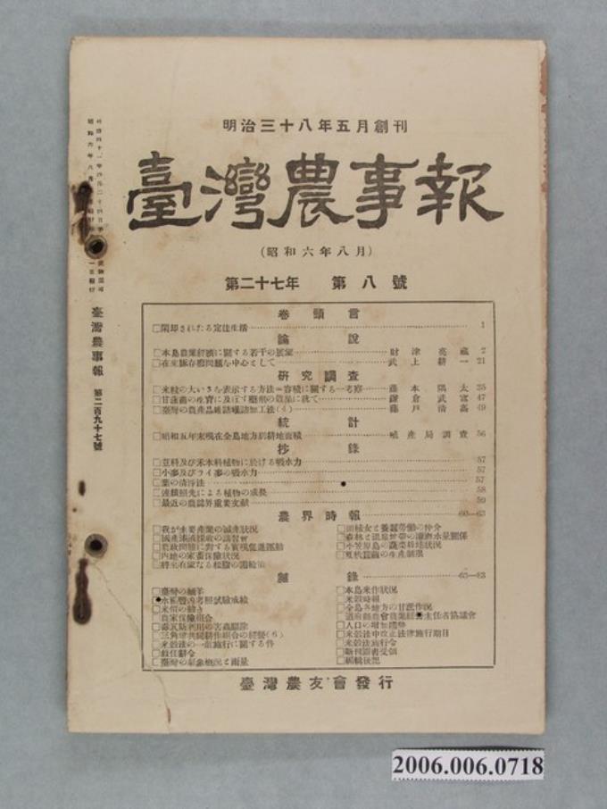 臺灣農友會發行《臺灣農事報》第27年第8號