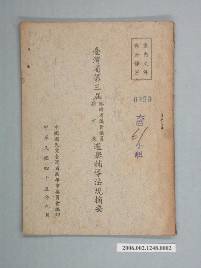 中國國民黨臺灣省高雄市委員會編印《臺灣省第三屆臨時省議會議員/縣市長選舉輔導法規摘要》