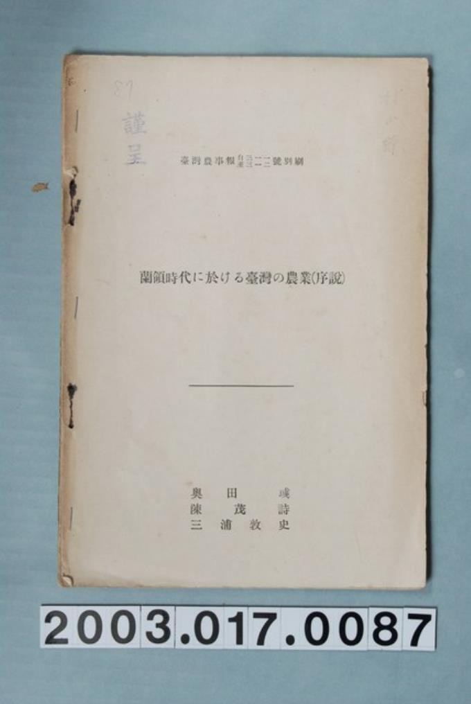 奧田彧等撰《荷蘭時代的臺灣農業:〈序說〉》