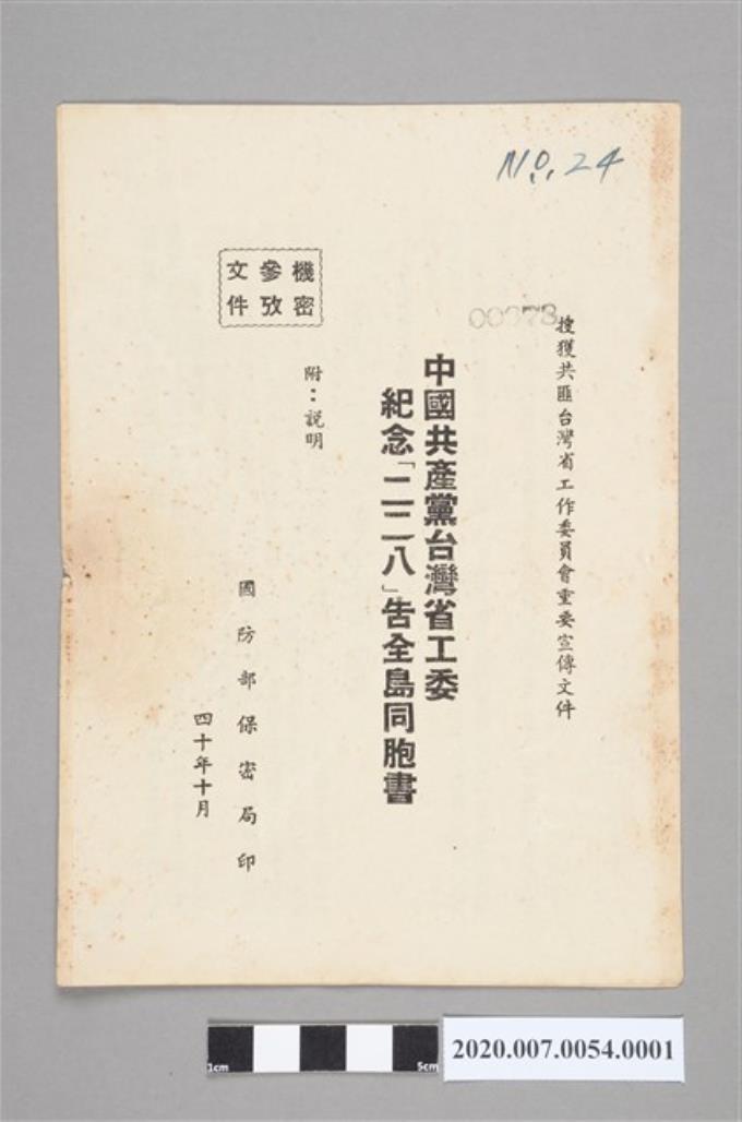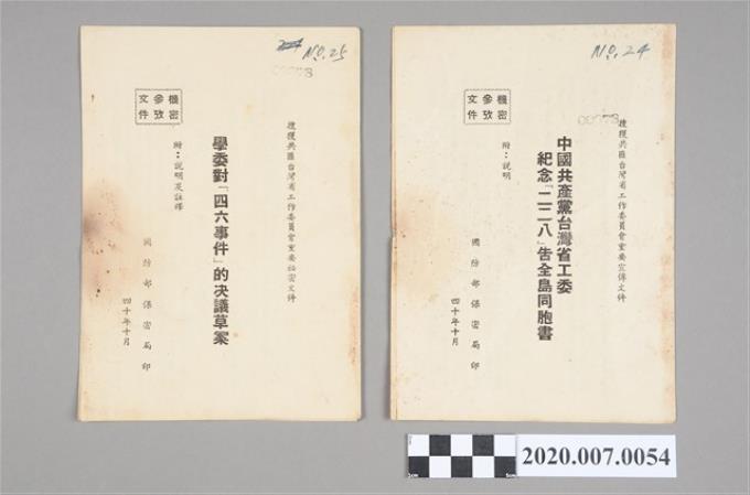 國防部保密局編印《學委對「四六事件」的決議草案》及《中國共產黨臺灣省工委紀念「二二八」告全島同胞書》