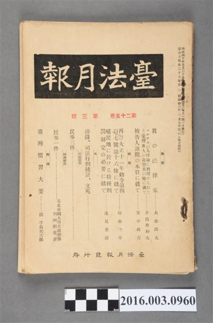 臺法月報發行所發行《臺法月報》第25卷第3號昭和6年3月5日