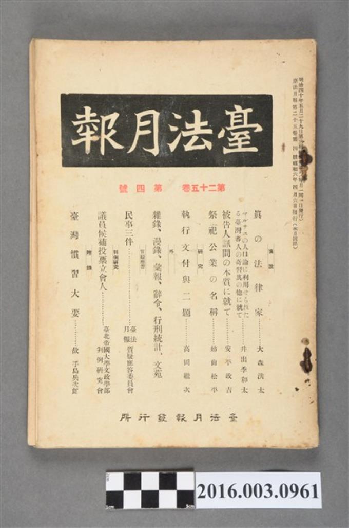 臺法月報發行所發行《臺法月報》第25卷第4號昭和6年4月6日