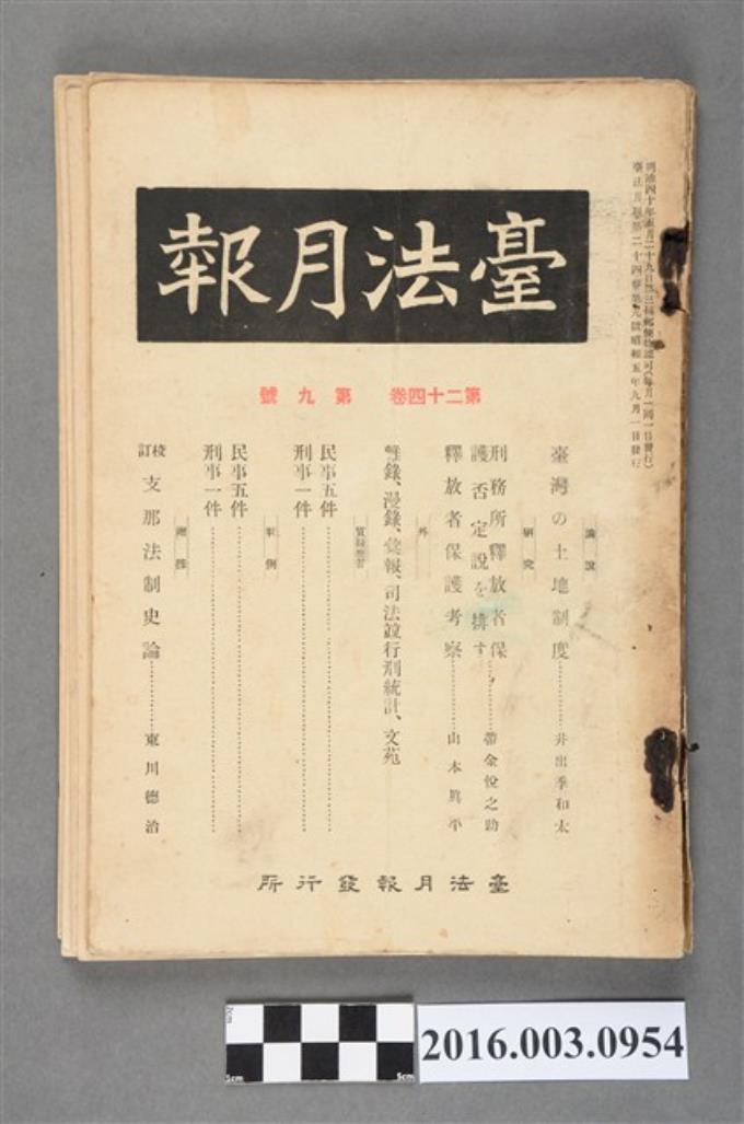 臺法月報發行所發行《臺法月報》第24卷第9號昭和5年9月1日