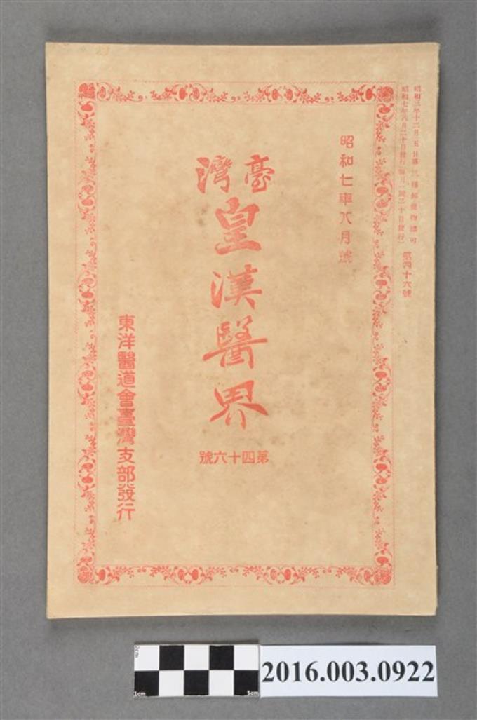 東洋醫道會臺灣支部出版《臺灣皇漢醫界》第46號昭和7年8月20日號