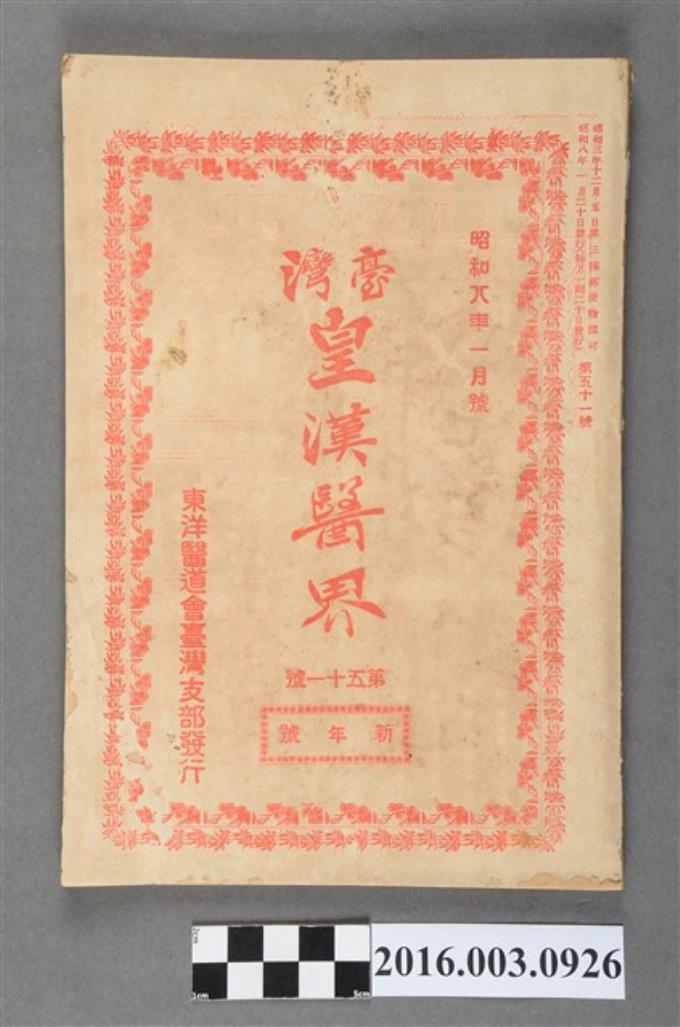 東洋醫道會臺灣支部出版《臺灣皇漢醫界》第51號昭和8年1月20日號