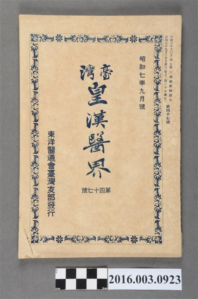 東洋醫道會臺灣支部出版《臺灣皇漢醫界》第47號昭和7年9月20日號