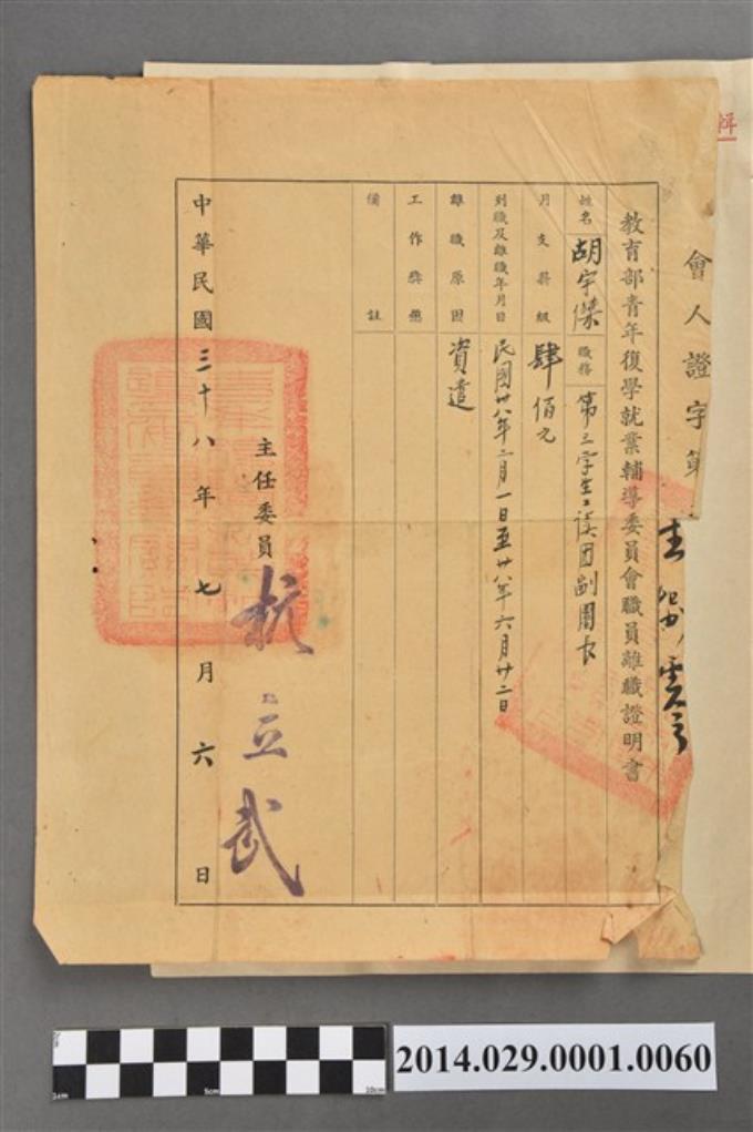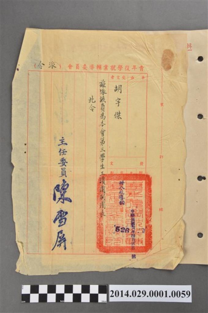 胡宇傑青年復學就業輔導委員會第三學生工讀團副團長派令