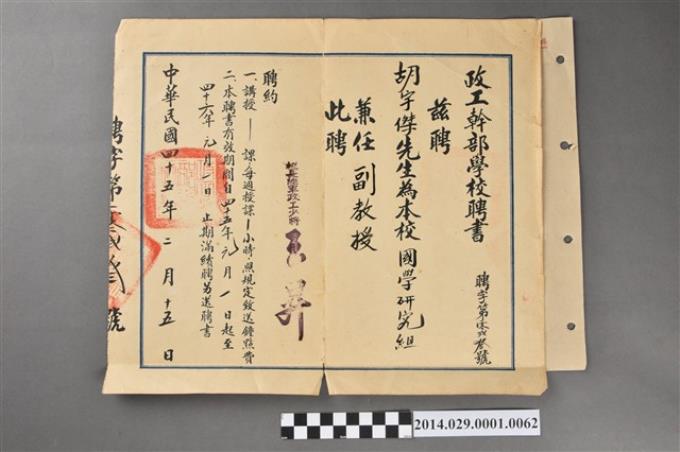 胡宇傑政工幹部學校國學研究組兼任副教授聘書