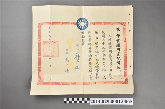 胡宇傑五十九年參加內政研究組成績優異獎狀