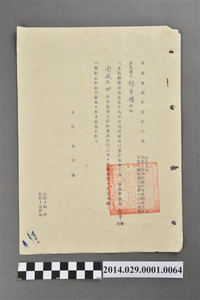 胡宇傑五十九年參加內政研究組成績優異通知書