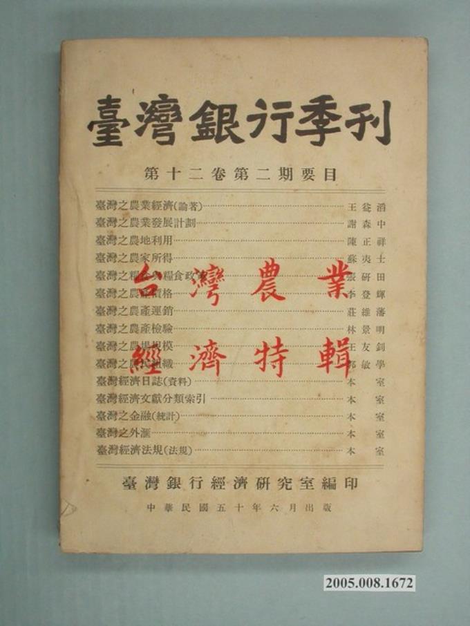 臺灣銀行經濟研究室編印《臺灣銀行季刊》第12卷第2期