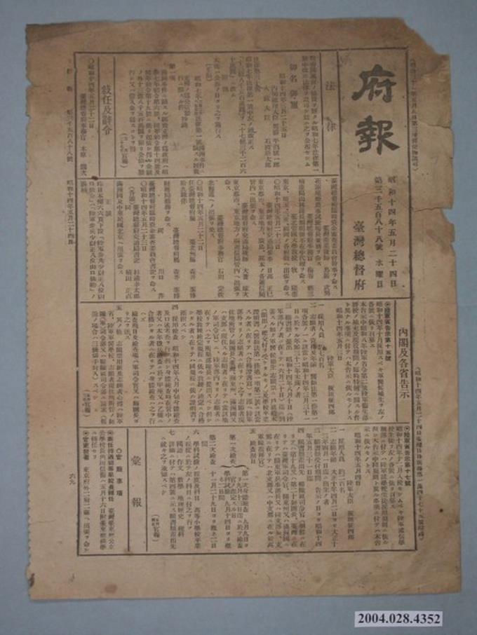 臺灣總督府出版《府報》第3588號昭和14年5月24日版
