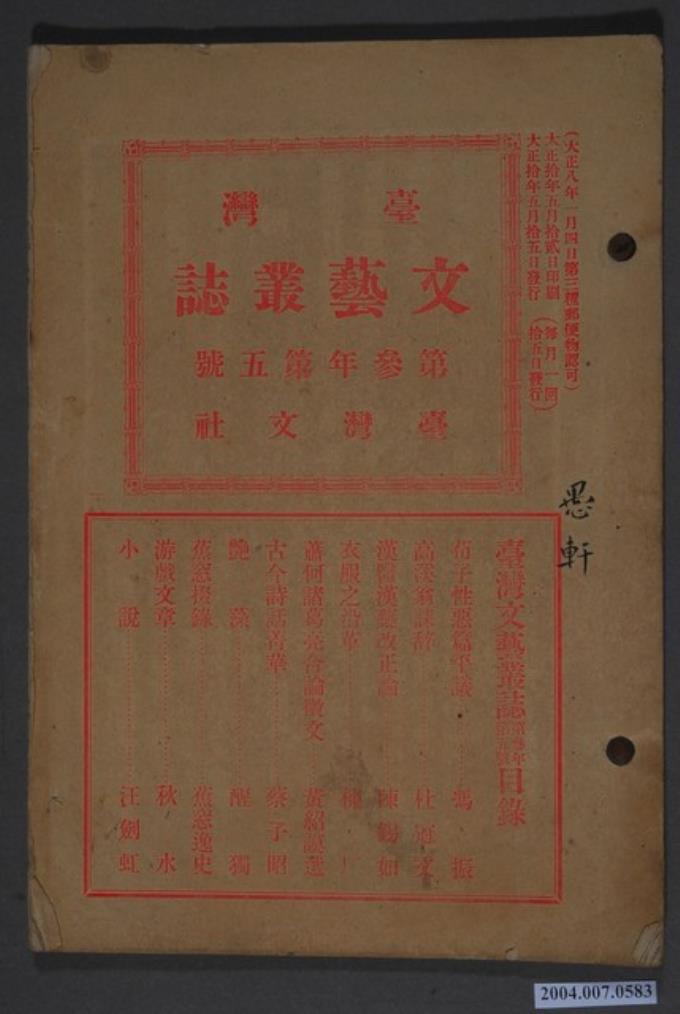臺灣文社發行《臺灣文藝叢誌》第參年第五號