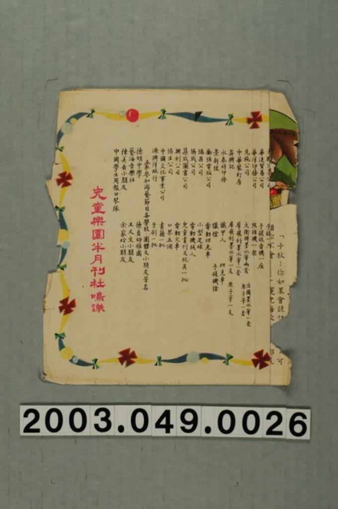 《兒童樂園》半月刊社鳴謝紙本散頁