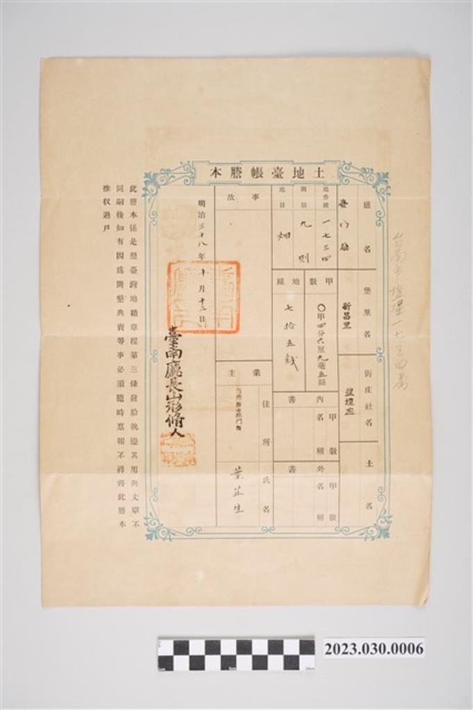 明治38年10月12日臺南廳長山形脩人給葉芷生臺南廳新昌里塩埕庄地番號1734土地臺帳謄本