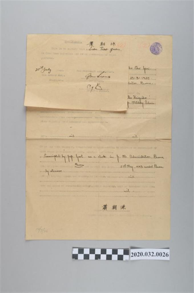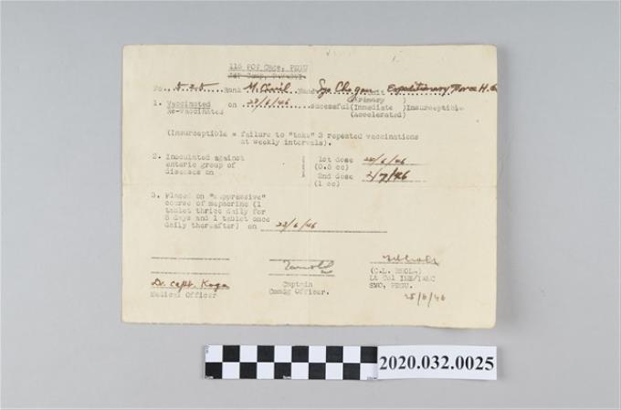 新加坡麥克阿瑟俘虜營開立具抗體証明