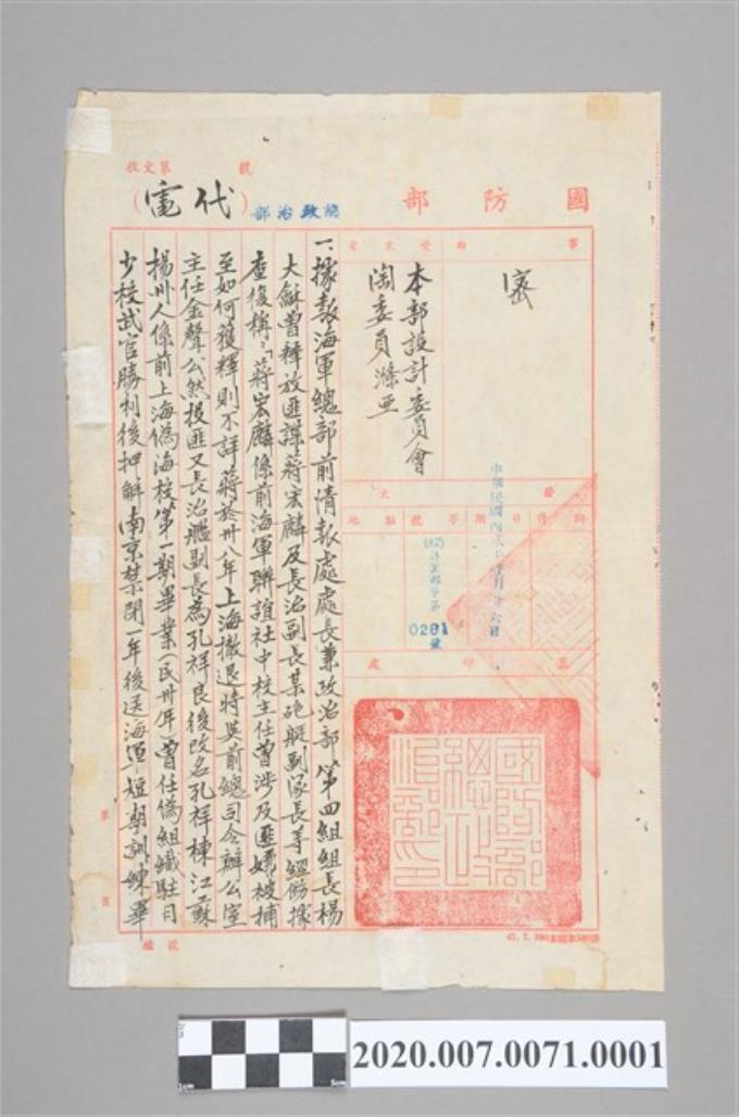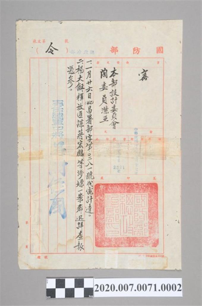國防部總政治部設計委員會關於楊大龢、蔣宏麟涉及匪嫌情報電文