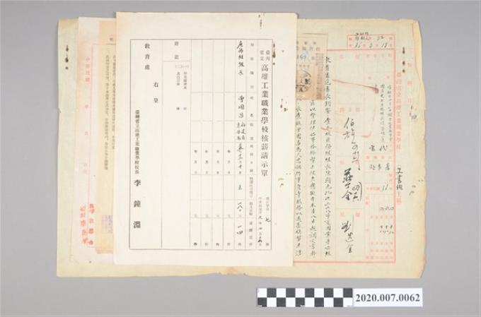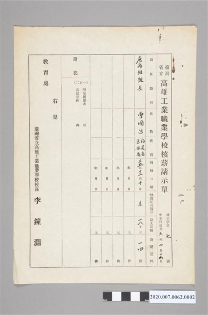 高雄工業職業學校228事件後解聘任用薪資文件之一