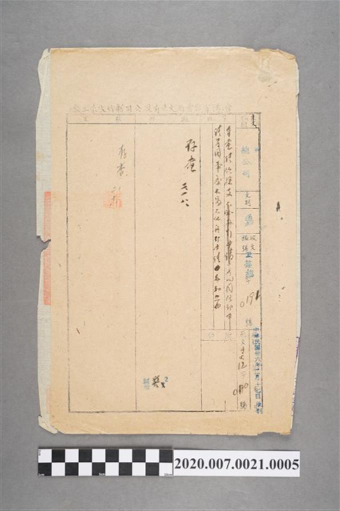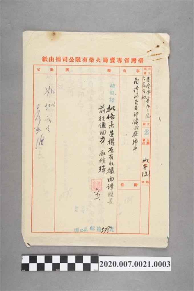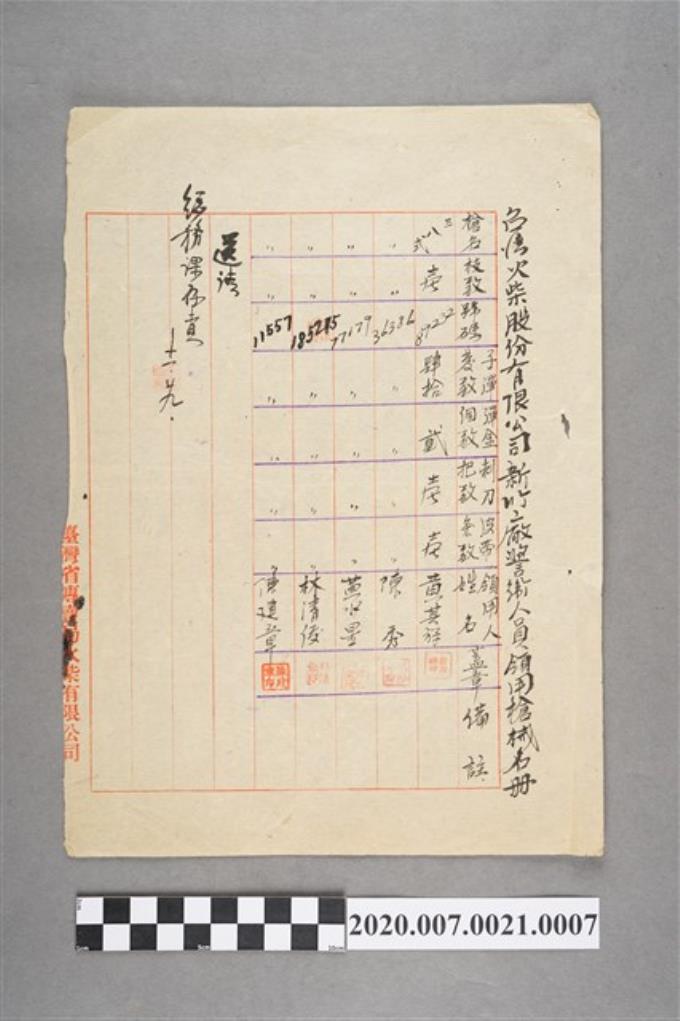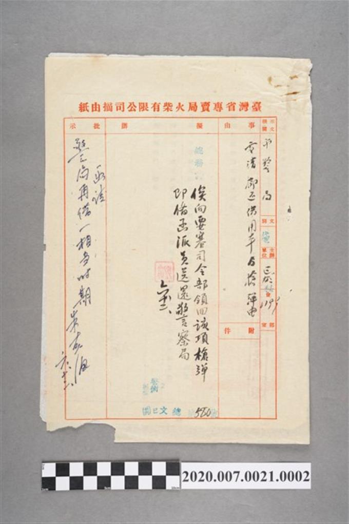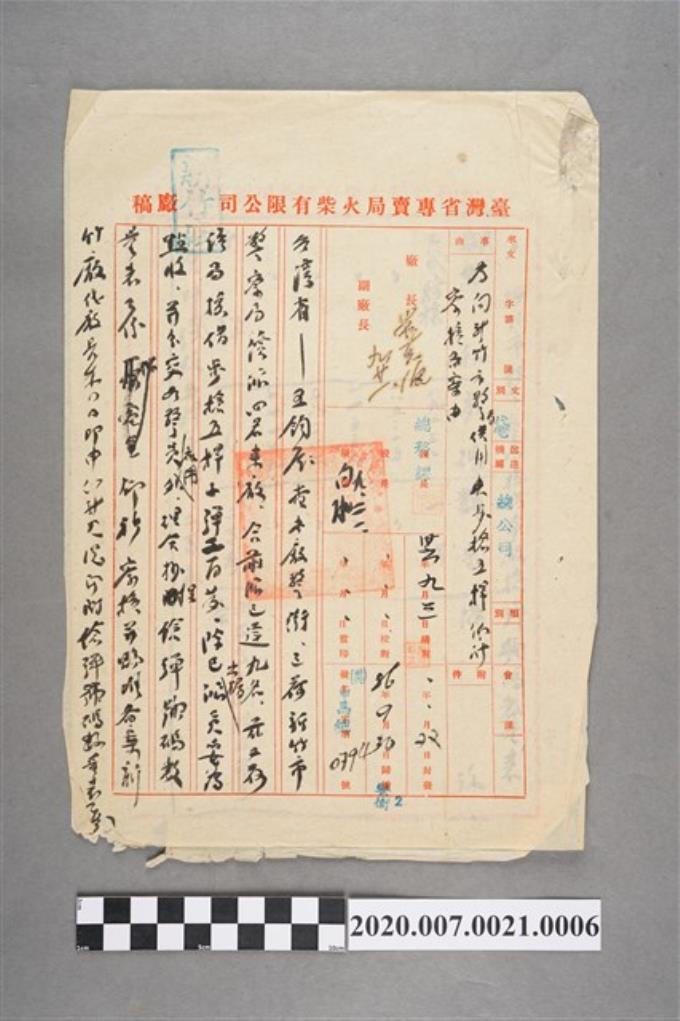 臺灣省專賣局火柴有限公司新竹廠代電第0794公文