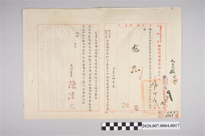 1947年4月7日臺灣省行政長官公署交通處鐵路管理委員會指令