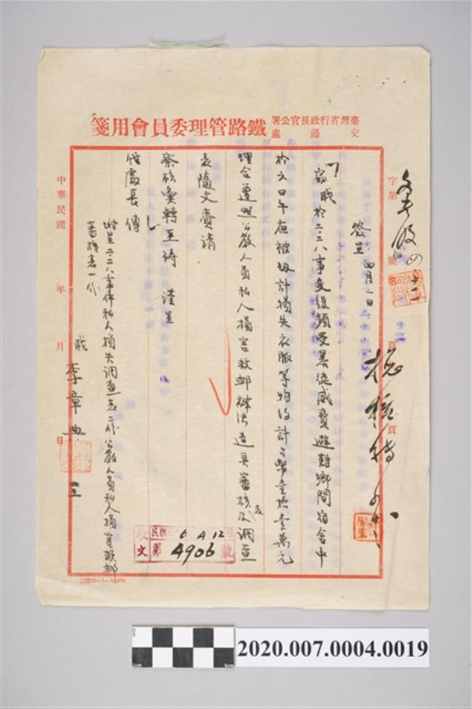 1947年4月4日憲兵第4團函鐵路管理委員會臺北辦事處