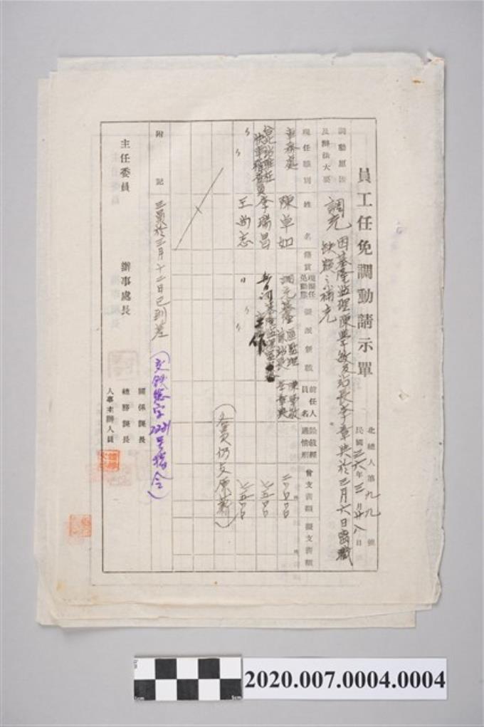 1947年3月31日「呈送陳學敏等任免請示單一份…」簽呈正副本
