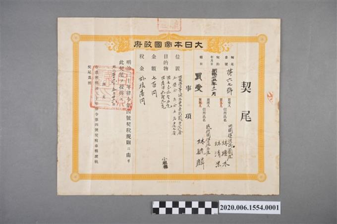 林毓麟黏貼契尾第六十七號大日本帝國政府