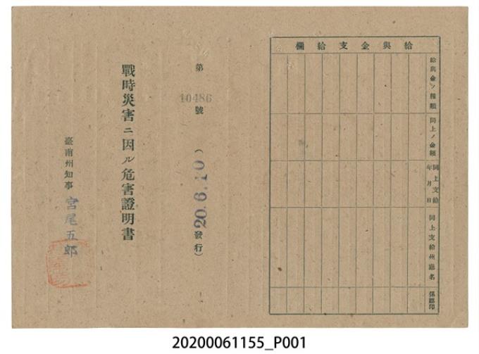 戰時造成的意外災害證明書第10486號(昭和20年6月10日發行)