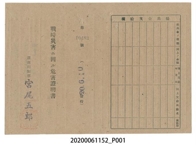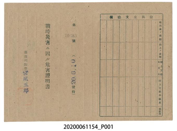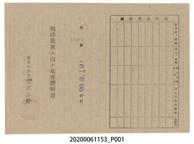 戰時造成的意外災害證明書第10484號(昭和20年6月10日發行)
