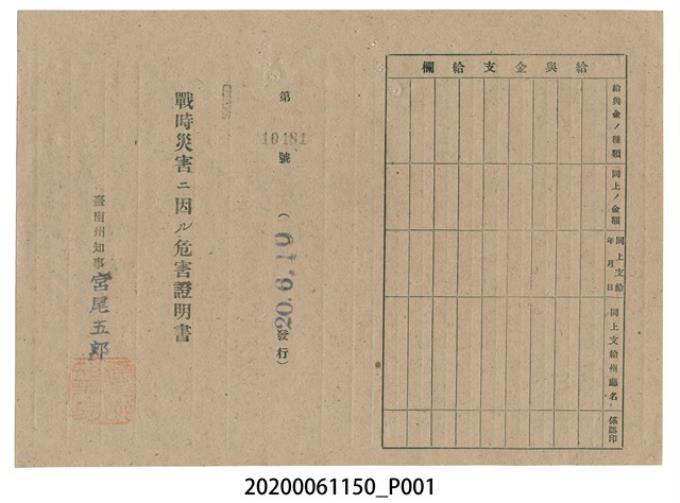戰時造成的意外災害證明書第10481號(昭和20年6月10日發行)