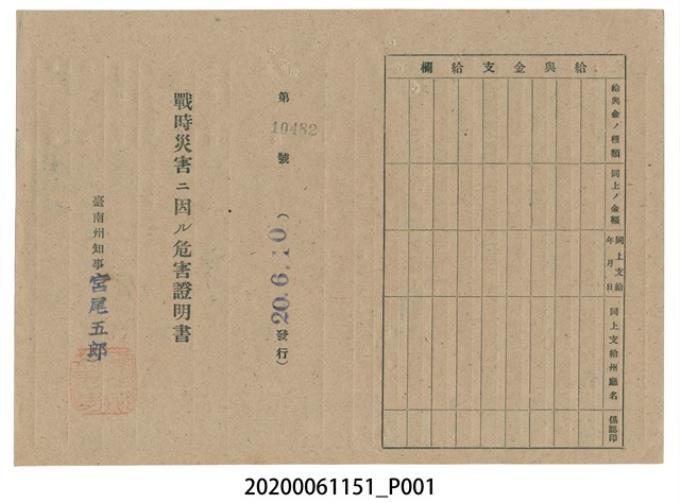 戰時造成的意外災害證明書第10482號(昭和20年6月10日發行)