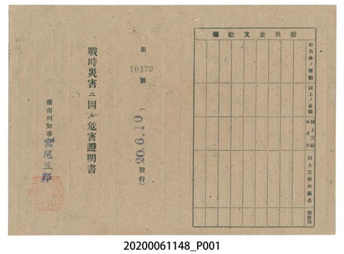 戰時造成的意外災害證明書第10479號(昭和20年6月10日發行)
