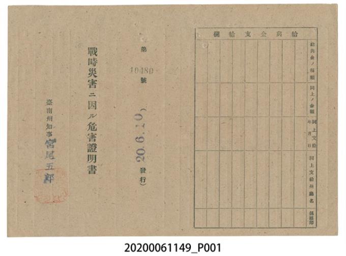 戰時造成的意外災害證明書第10480號(昭和20年6月10日發行)
